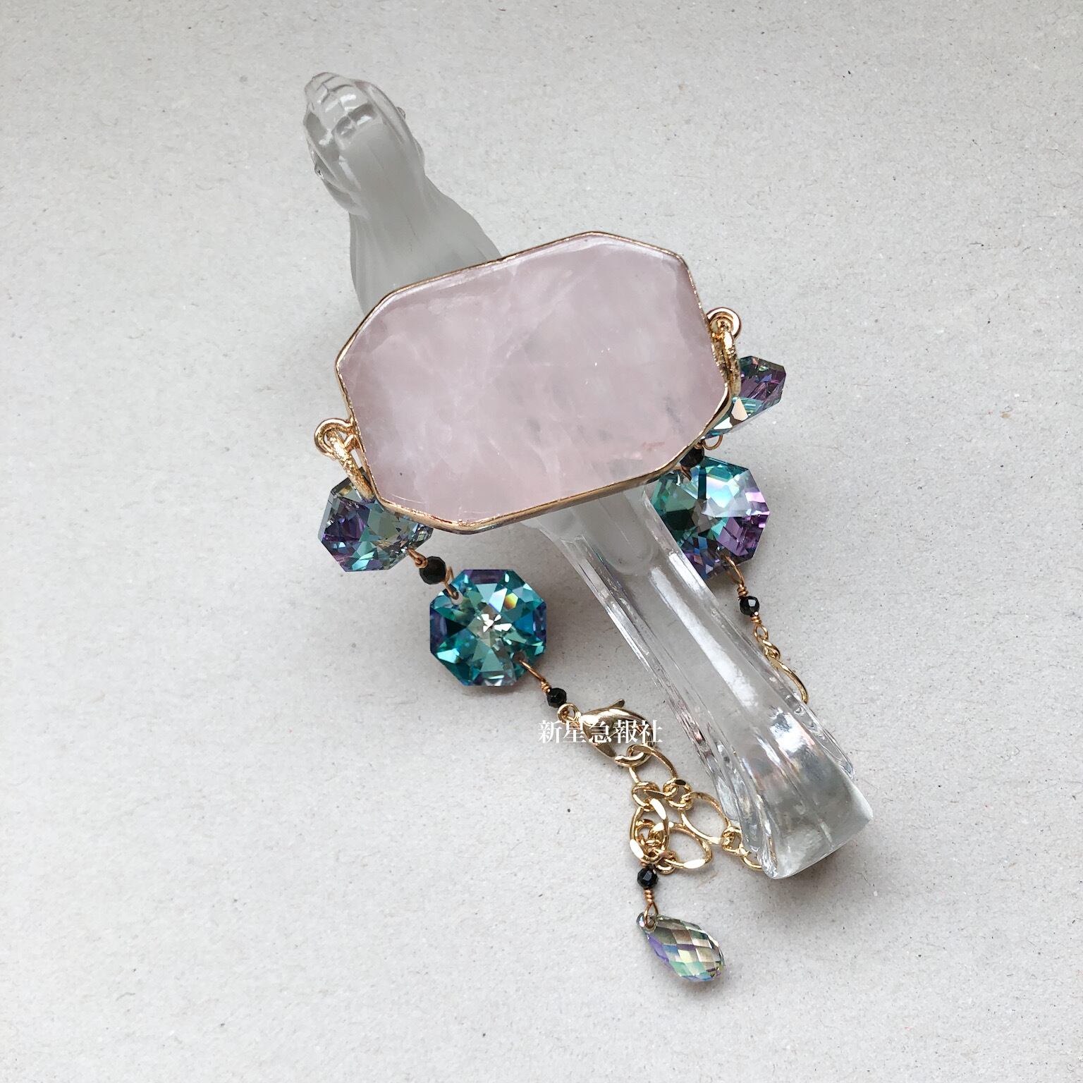 ローズクォーツ、ガラス(スワロフスキー社製)、黒曜石、ブラックスピネル