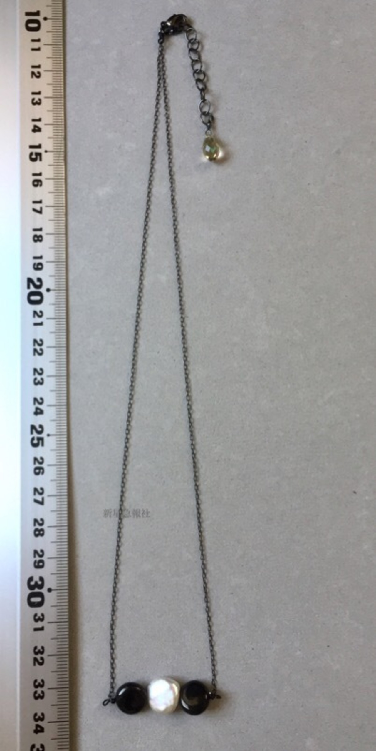 アクセサリーはジェット、淡水真珠、