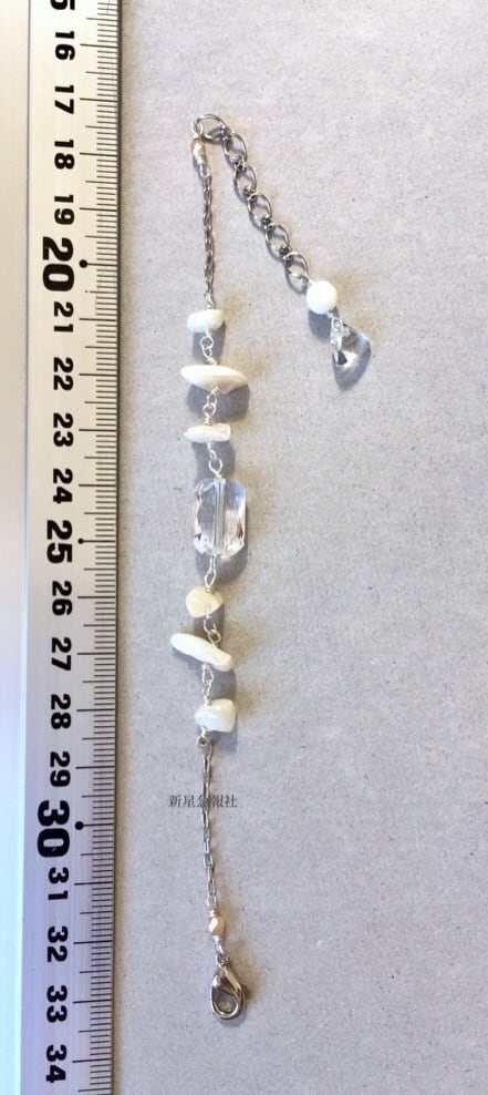 アクセサリーは貝素材、ガラス(スワロフスキー社製)を含みます。