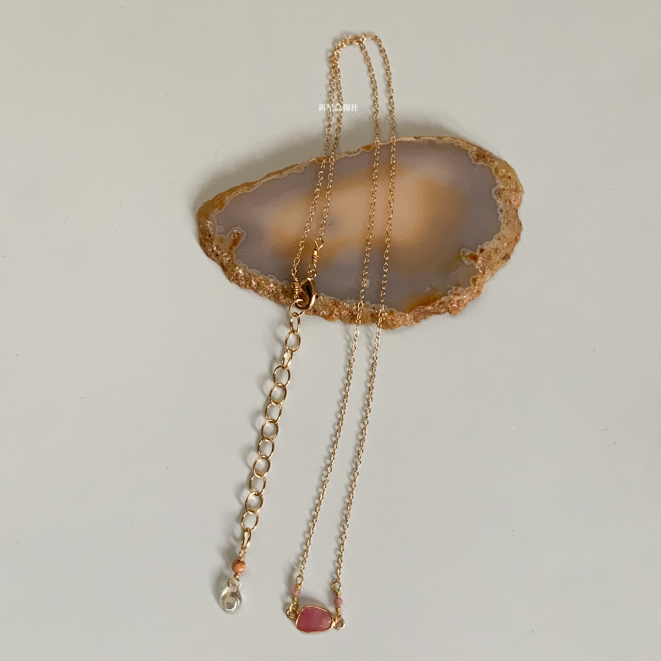 枠付きのルビーの薄片をトップに、小さなピンクトルマリンで繋いで。