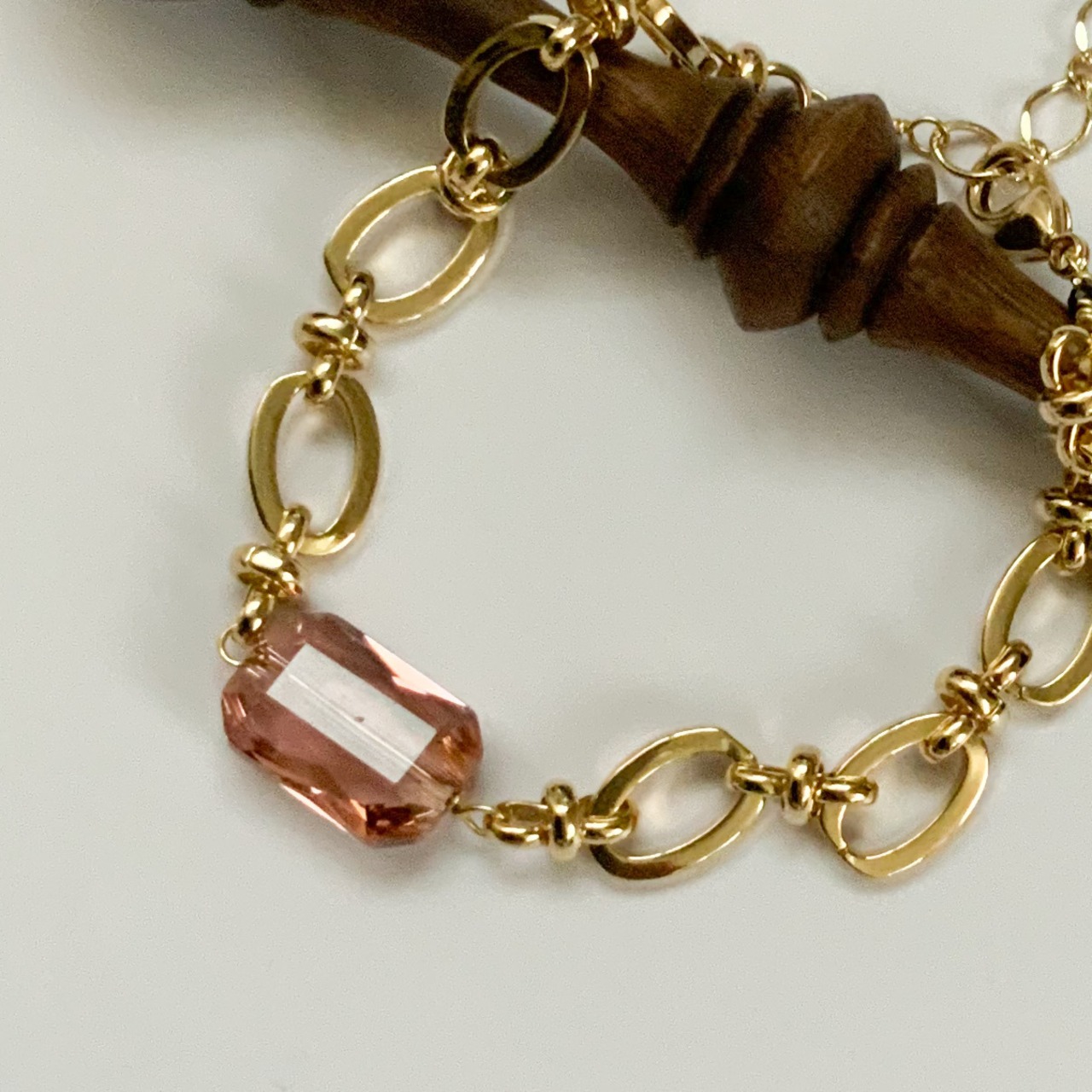 今はもう手に入れづらい、すこし古いデザインのレクタングルのガラスビーズを使ったブレスレットです。手持ちのデッドストックを使ったので、表面に光が当たるとかすかに分かるカケがあります(写真をご覧ください)。