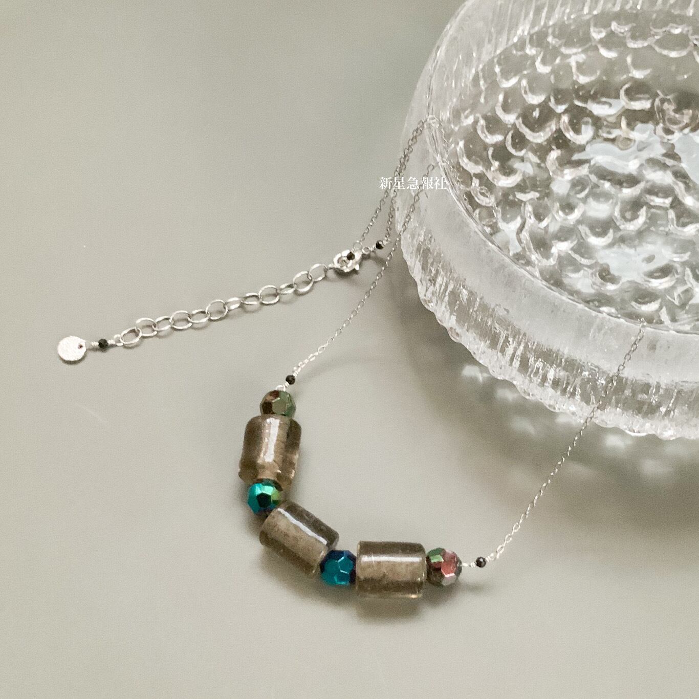 ガラスビーズには製法由来の気泡が多くあり、存在感があります。