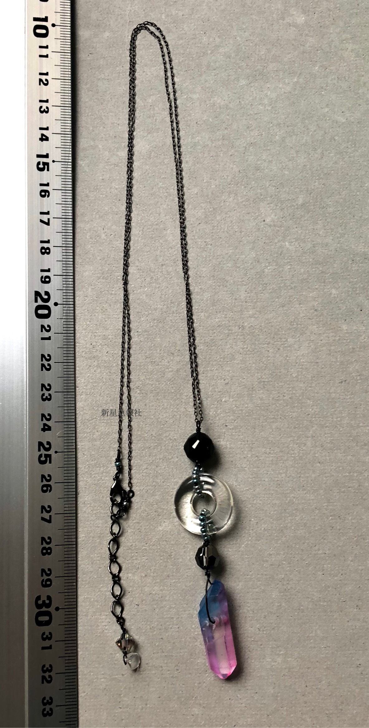 アクセサリーは着色水晶、オニキス、
