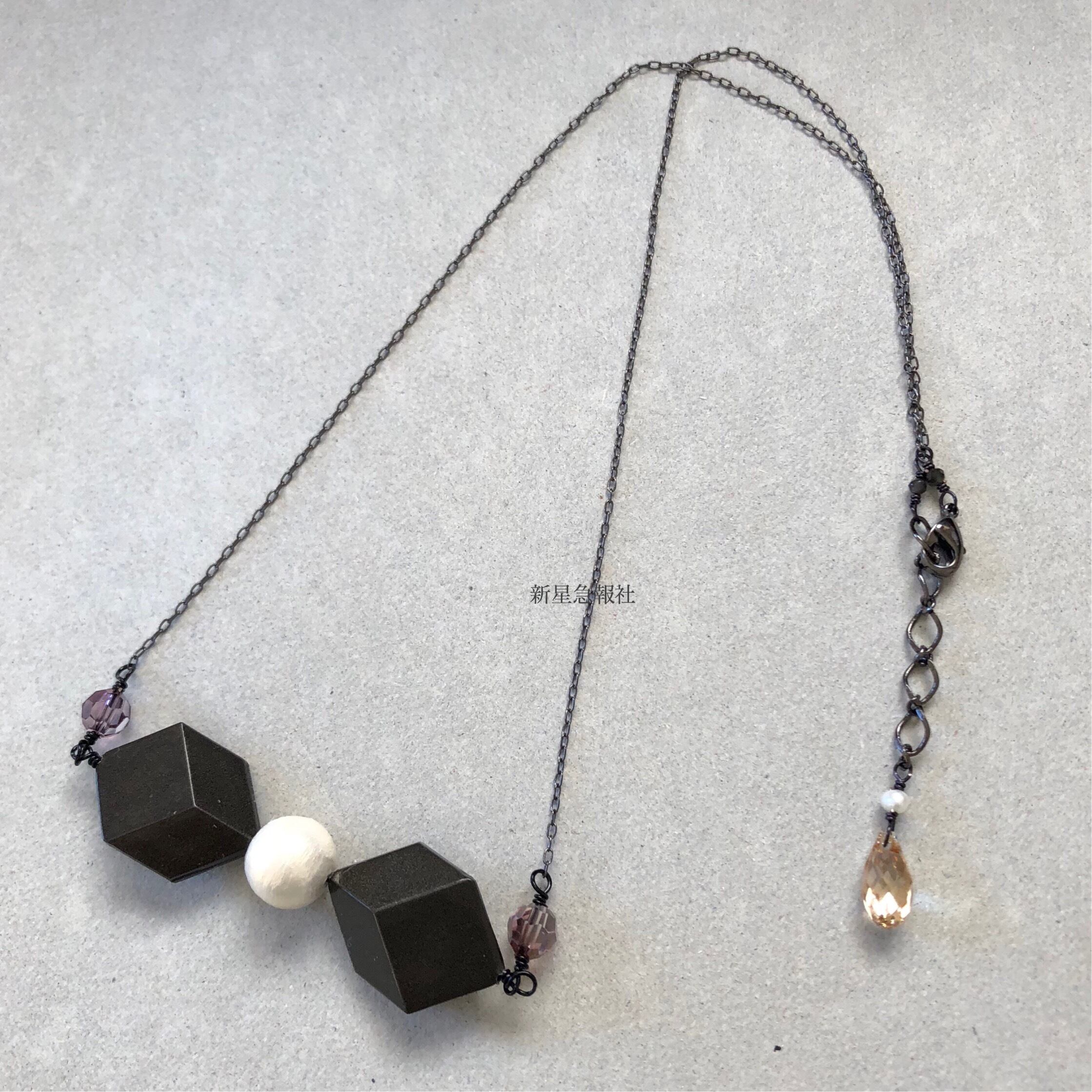 黒曜石、淡水真珠、ガラス(スワロフスキー社製)を含みます。