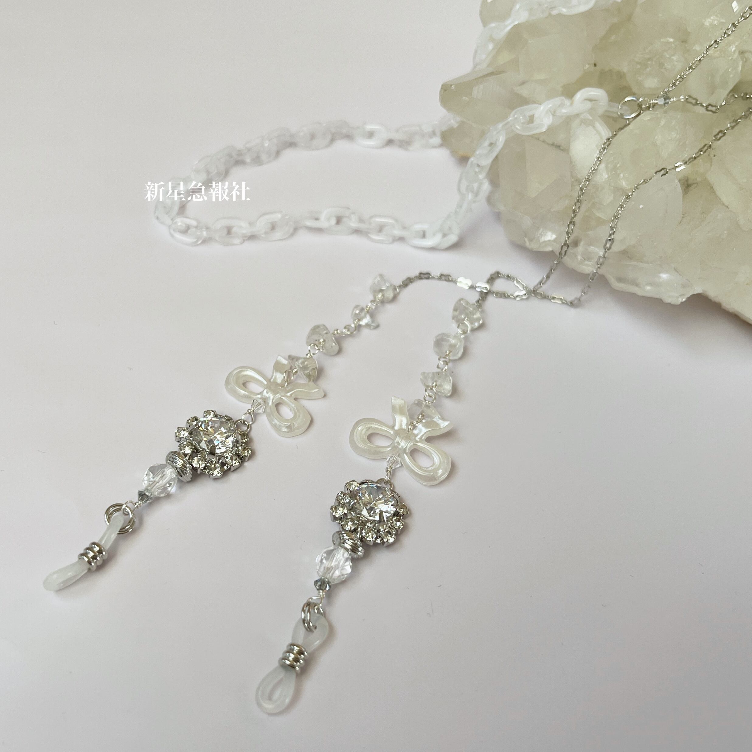 上下のパーツは澄んだ水晶に白いアクリルリボンと